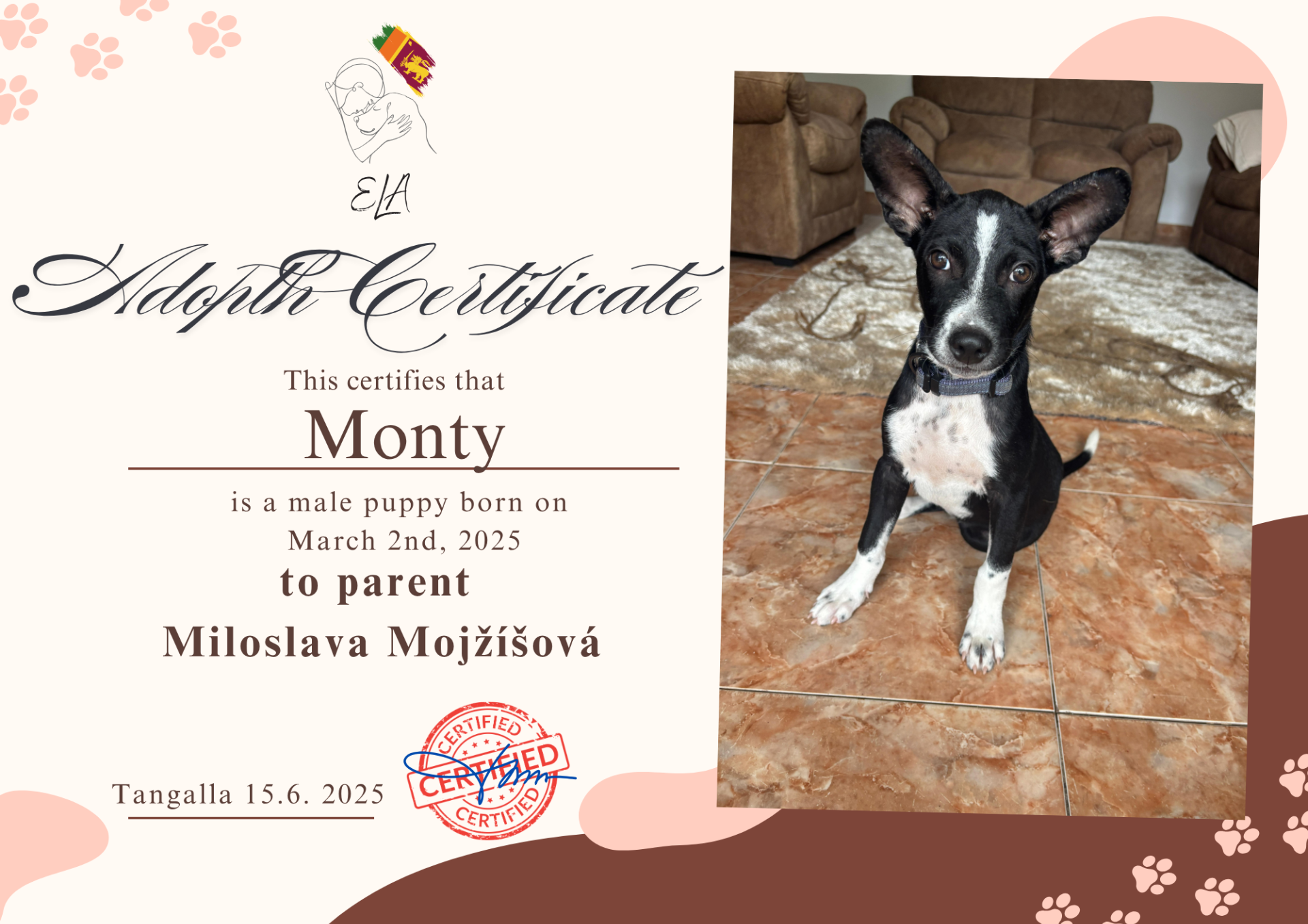 Naše teprve 3 měsíční štěňátko Monty našlo svého prvního adoptivního rodiče na dálku – člověka s velkým srdcem, který se rozhodl podpořit jeho cestu za lepším životem, i když ho nemůže mít u sebe doma.